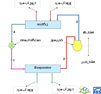- تبخیر کننده : با انتقال گرما به مبرد که به گاز تبدیل می شود ، آب یا آب / گلیکول یا هوا را خنک می کند. کمپرسور – این گاز را می گیرد و فشار آن را افزایش می دهد تا هوای محیط یا آب بتواند گرما را از بین ببرد.